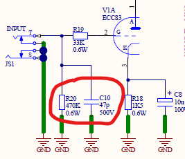 R20が470KΩになっていて、並列にC10が47pFで入っています。