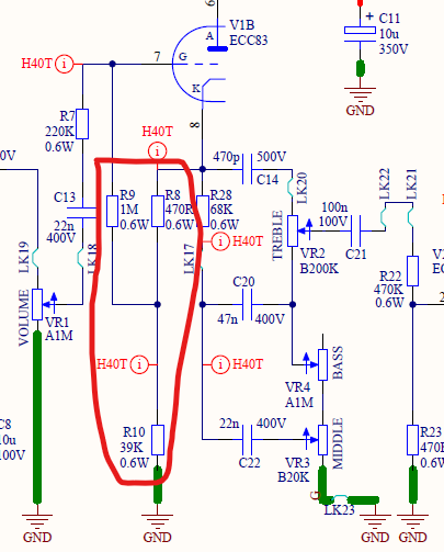 V1BのG(グリッド)に入る前にR9-R10-GNDとなってますが、これも少しハイ落ちさせていると思います。
