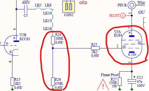 最後に、R24,26でまた分圧して出力調整して、V3A(パワー管のEL84)でスピーカー駆動レベルに信号増幅します。