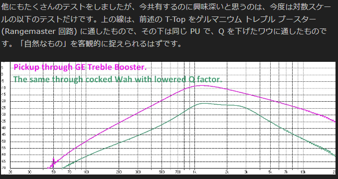 こちらはT-TOPをRangeMasterと同じ回路に通したもの(上の線)と、Q係数を下げたワウをOFFの状態で接続したもの(下の線)ですが、中音域が自然に盛り上がっています。