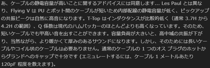 ギター内部の配線やシールドケーブルは多少の静電容量を持っているので、コンデンサのような役割を果たすことで共振周波数に影響することを言っています。