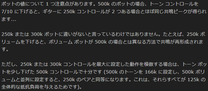 500kポットでも、ボリュームを7くらいに下げると、250kポットと同じくらいの共鳴ポイントが得られると言っています。
