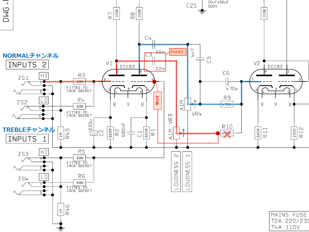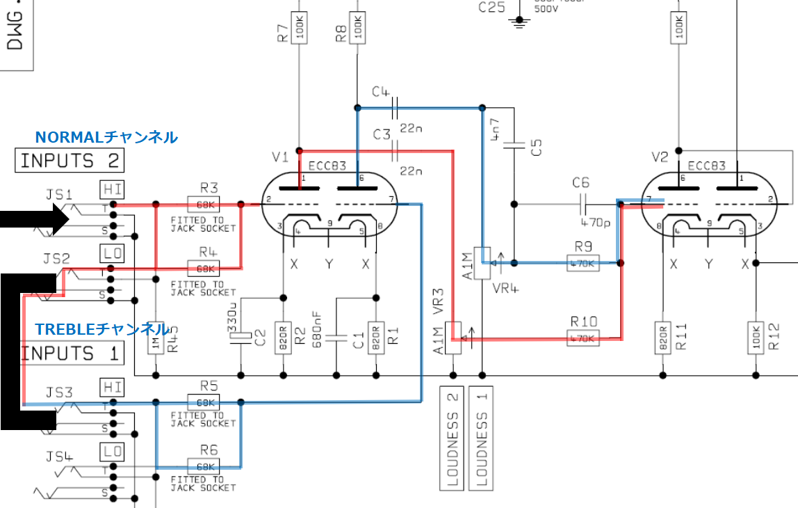 NORMALチャンネルはV1の左側、TREBLEチャンネルはV1の右側で増幅されます。