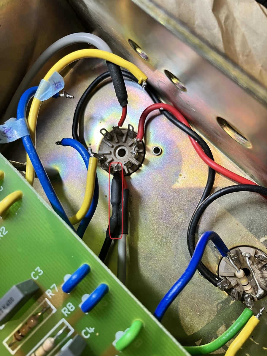 グリッドストッパー抵抗は真空管のグリッドにできるだけ近いところに入れたほうが良いので、V1の7番端子に直接接続します。そのため、R10は取り外してしまいます。
