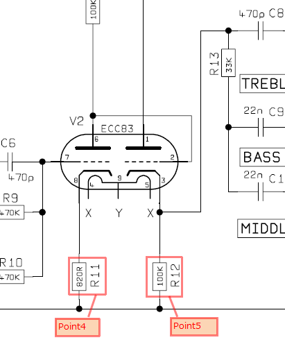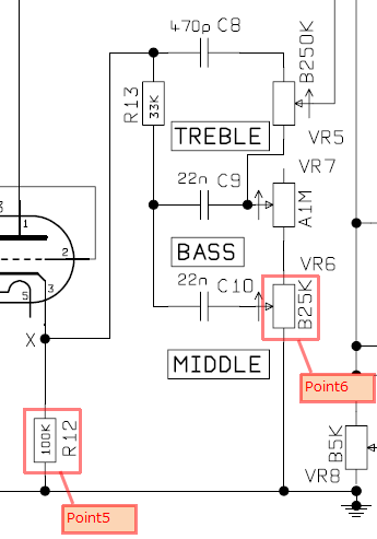 右側のV2bはEQにかける前にインピーダンスを下げるためのカソードフォロワーになっています。カソード部のPoint5の100kはMarshallの伝統的な定数です。