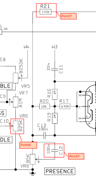 EQ回路の後はフェーズインバーターへ続きますが、ここにプレゼンス回路があります。